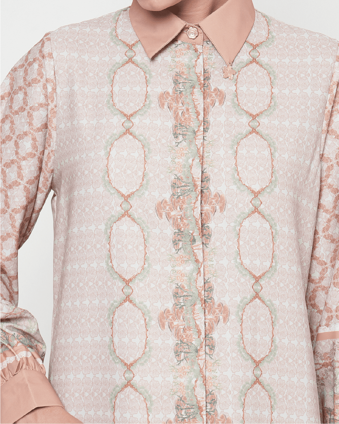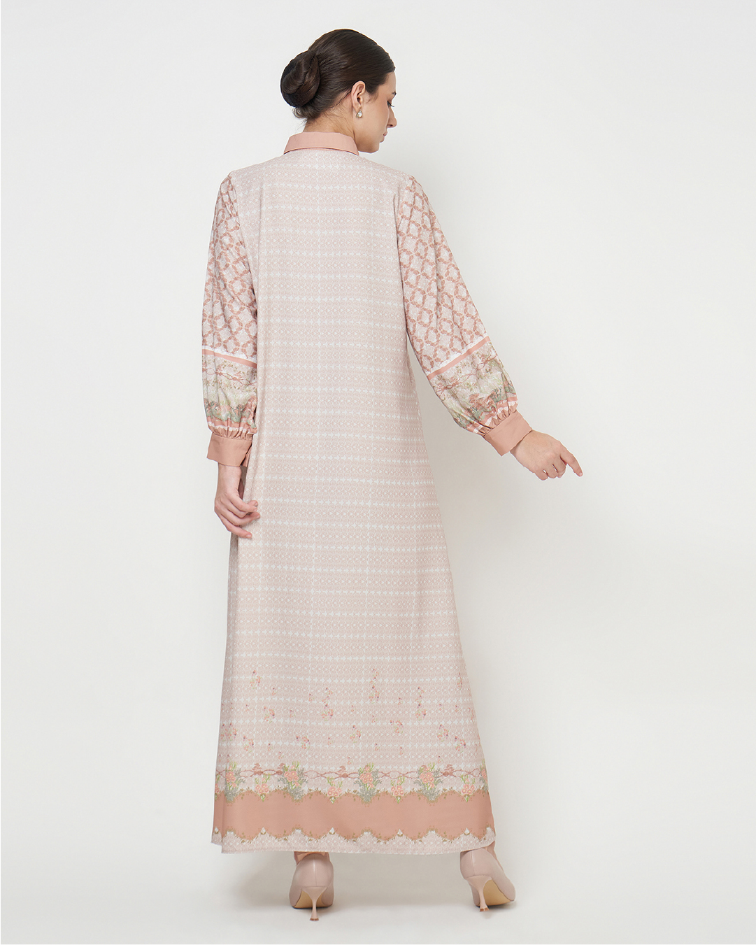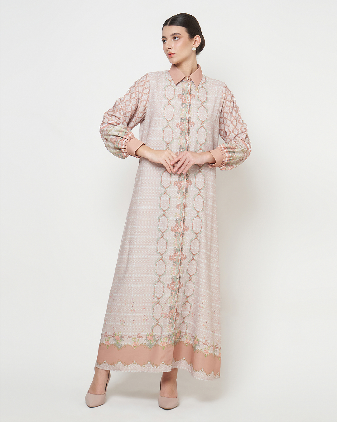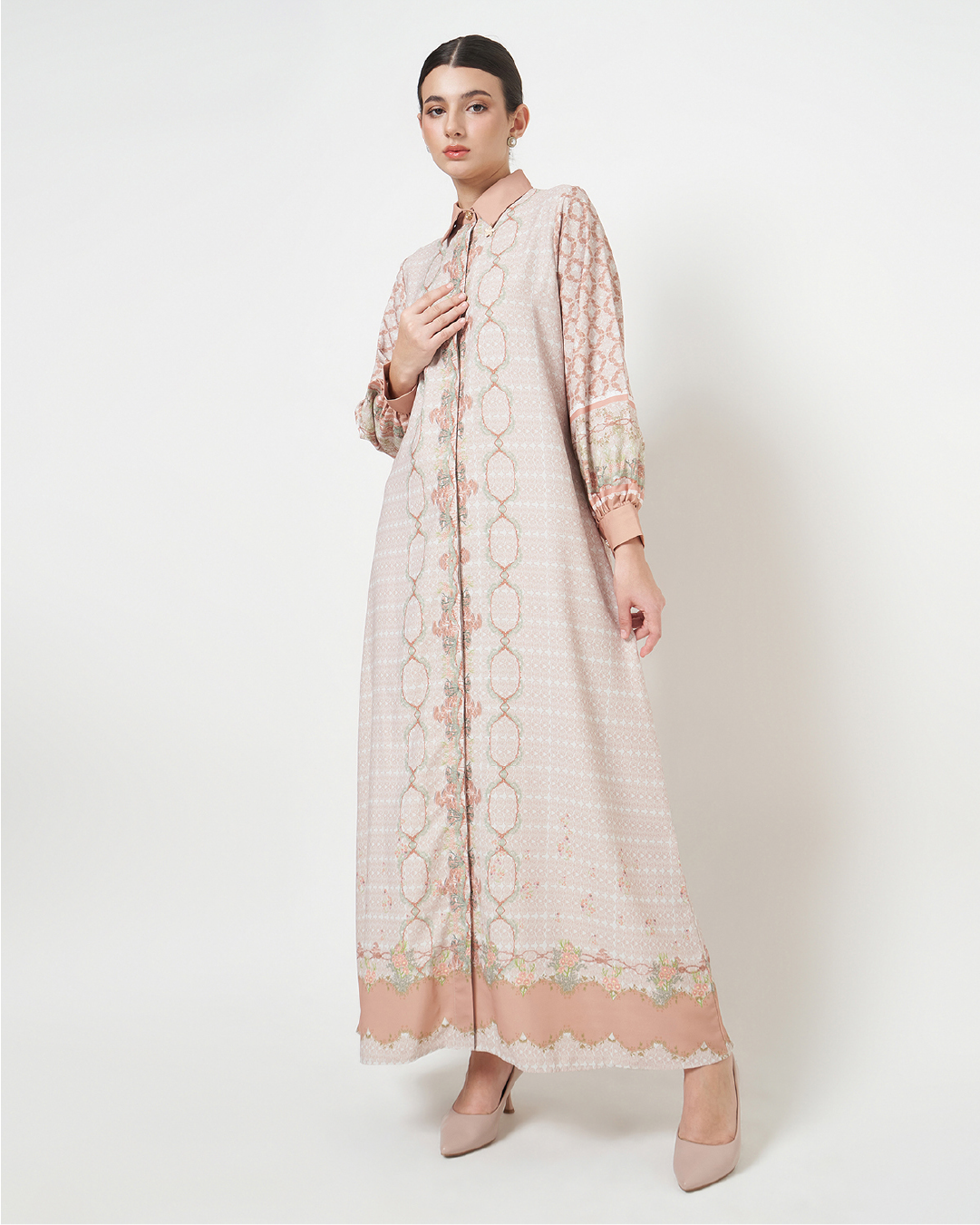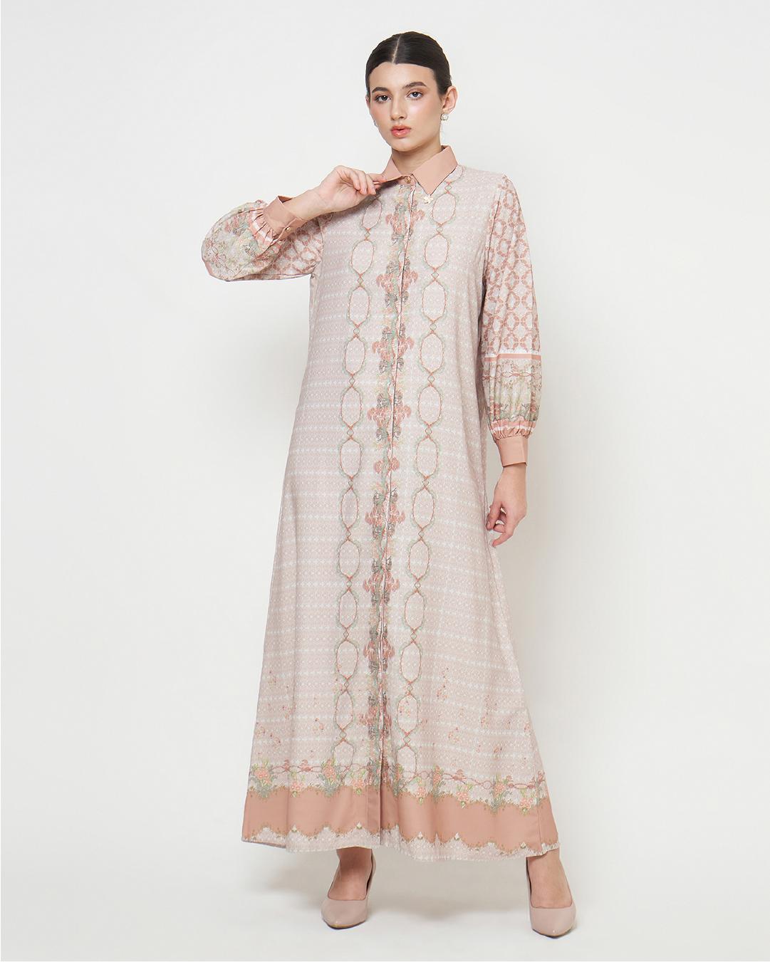Amara adalah abaya panjang berbahan Airtech yang ringan dan breathable, nyaman dikenakan sepanjang hari tanpa terasa panas atau berat. Motif cetak terinspirasi dari pola alami spora jamur, memberi sentuhan visual yang lembut dan tidak berlebihan.