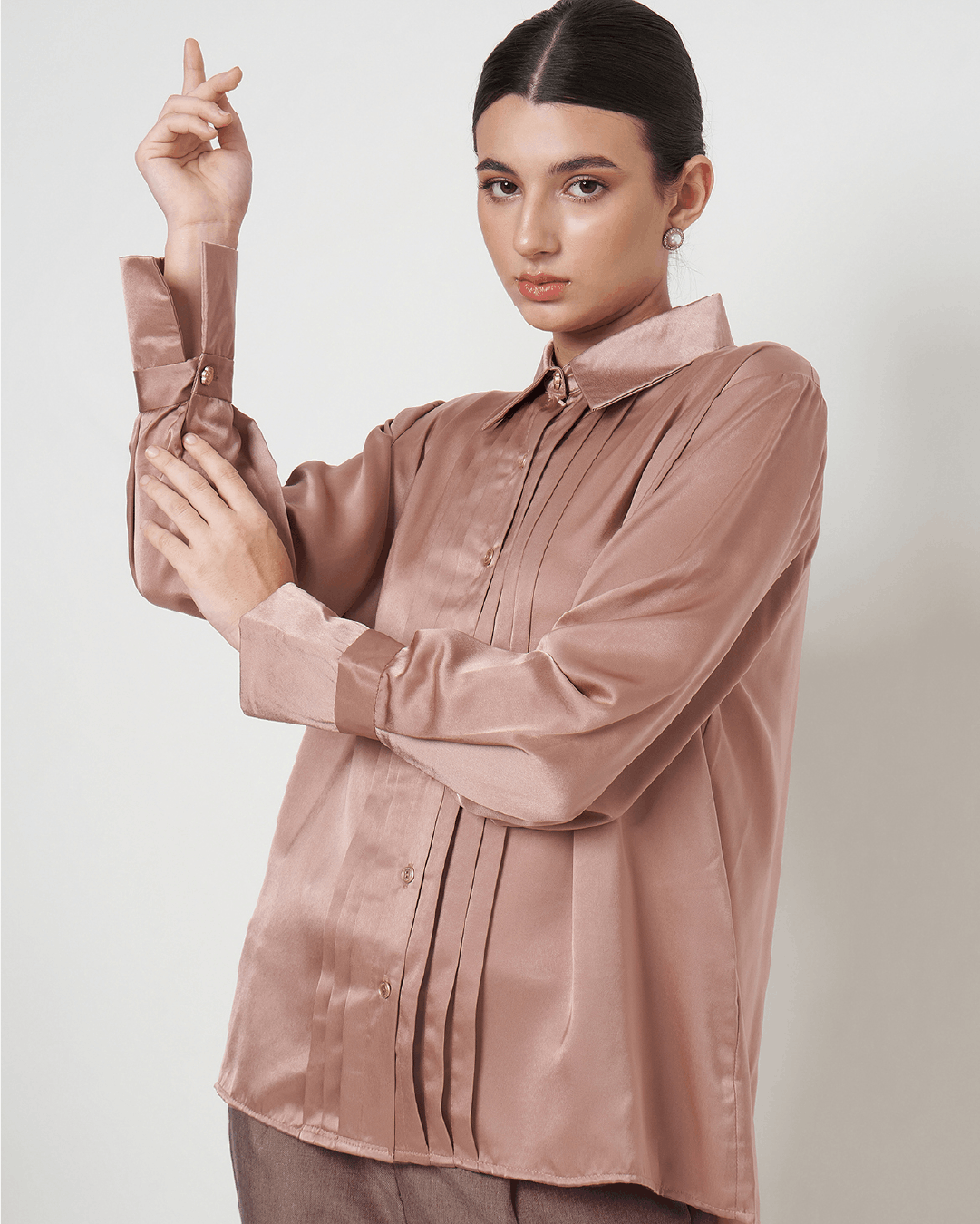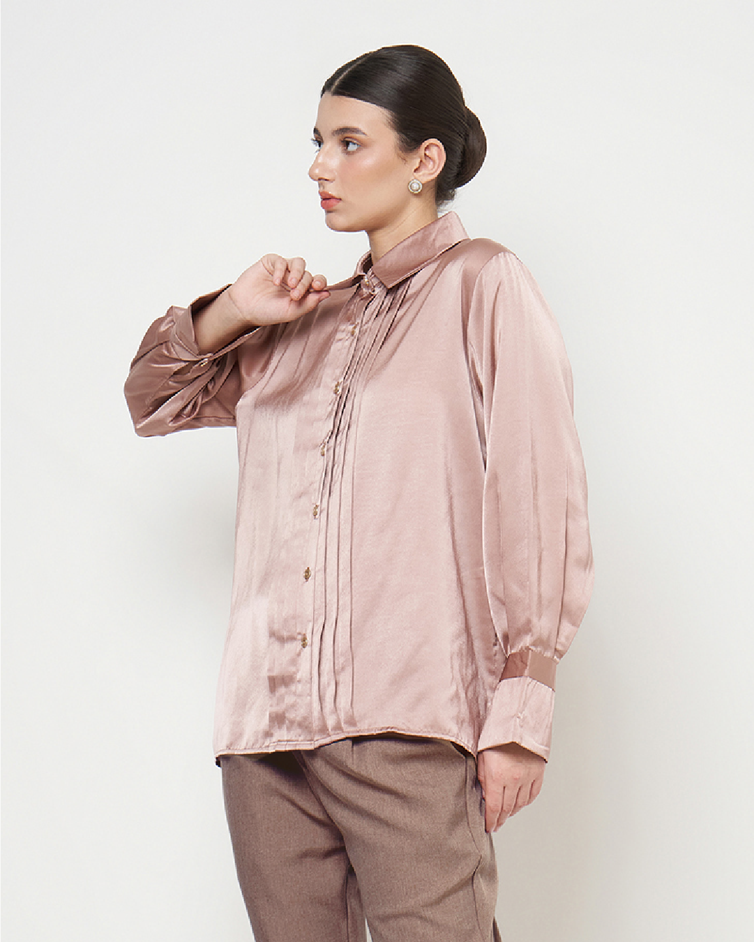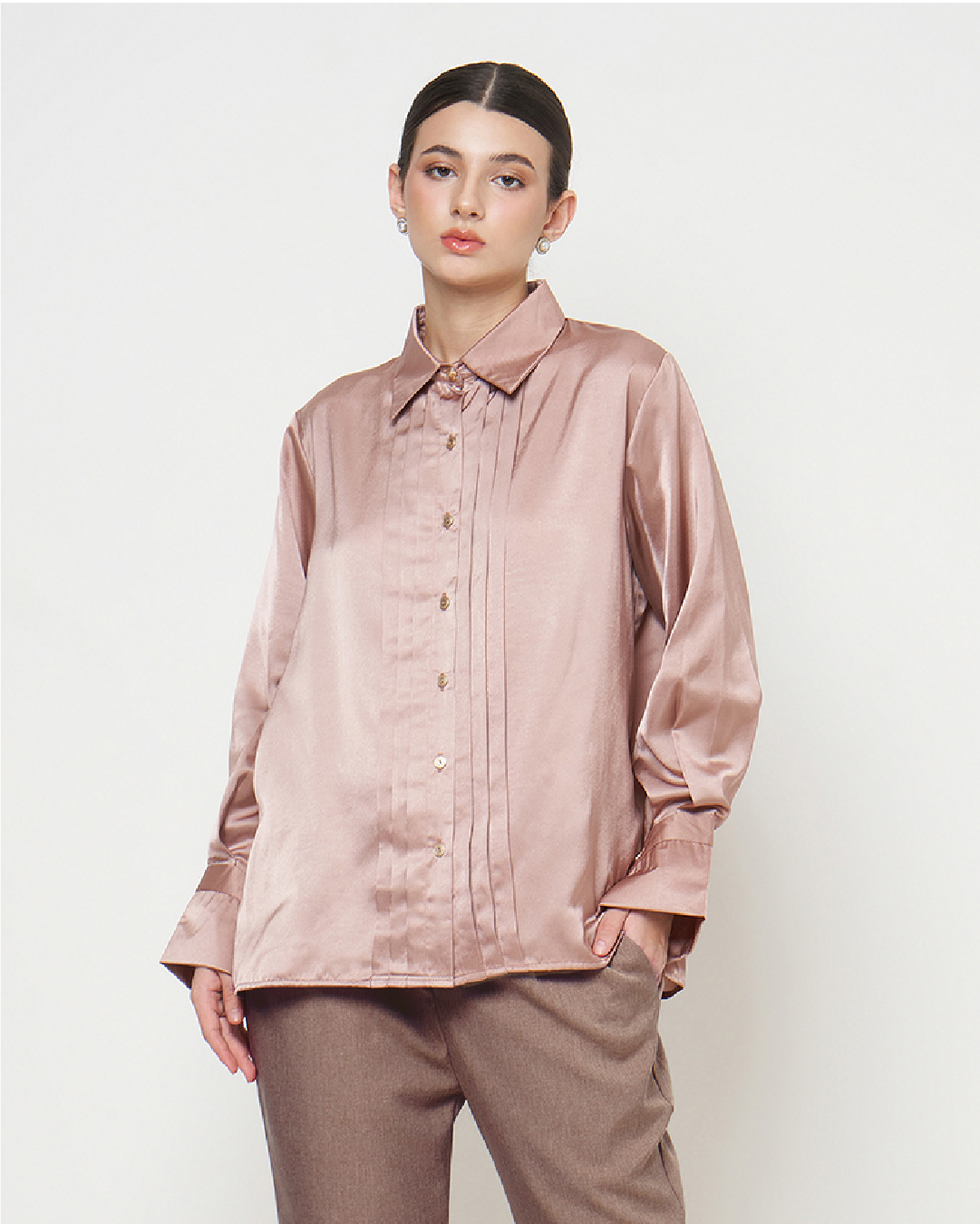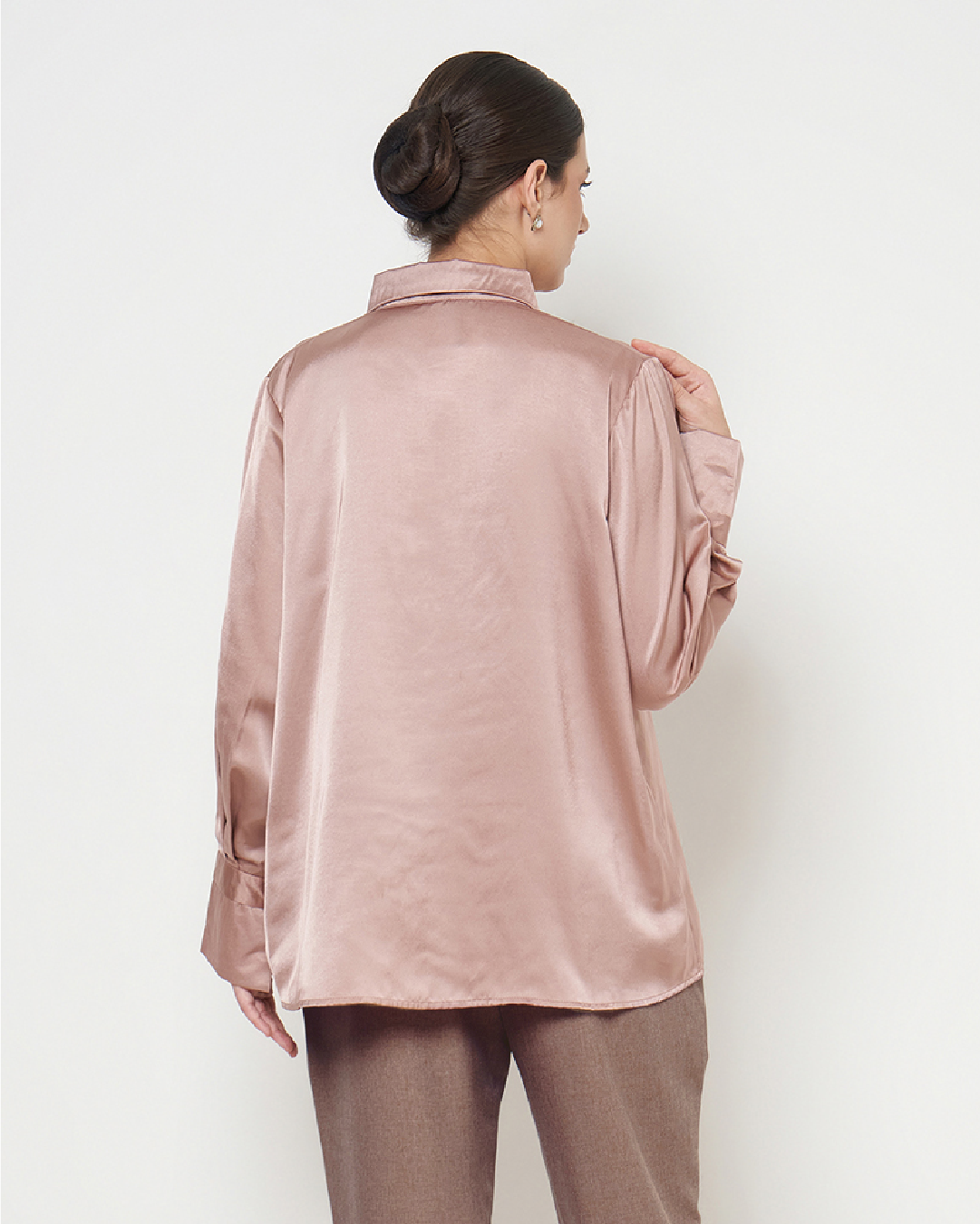 Leona adalah kemeja satin dengan detail opnesel (overlap panel) yang menciptakan tampilan lebih rapi dan jatuh dengan natural. Potongannya membantu menyamarkan area tubuh tanpa terasa bulky, menjadikannya nyaman dan flattering untuk berbagai bentuk badan.